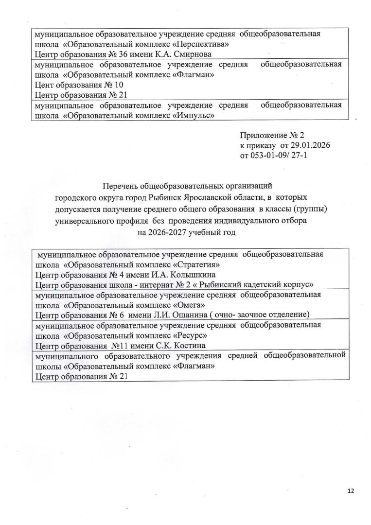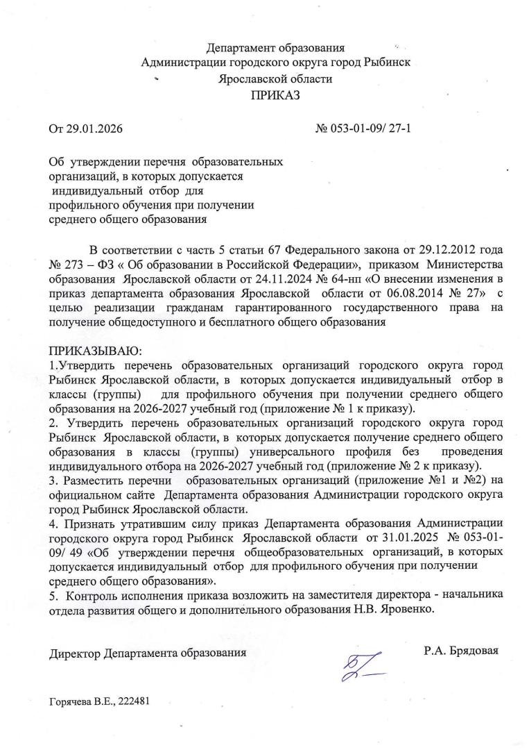 - Приказ Департамента образования Администрации городского округа город Рыбинск Ярославской области "Об утверждении перечня общеобразовательных организаций, в которых допускается индивидуальный отбор для профильного обучения при получении среднего общего образования Приложения 1часть, 2 часть